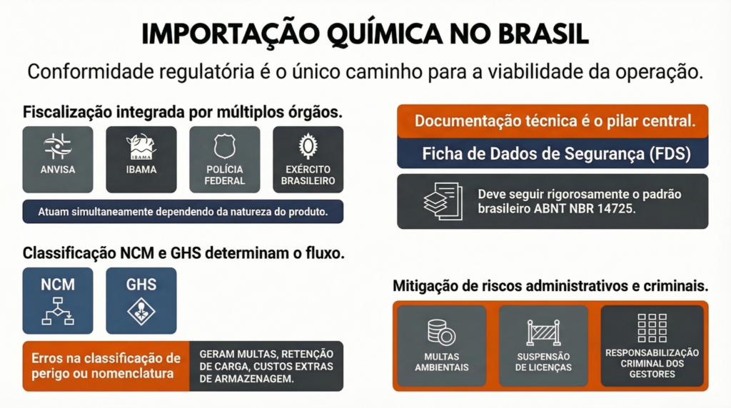 A importação de substâncias químicas está sujeita a múltiplas legislações, incluindo normas ambientais, sanitárias, de segurança química, controle de produtos perigosos e comércio exterior.